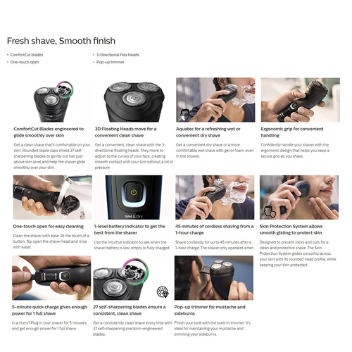 ماشین اصلاح موی صورت فیلیپس مدل S1323 از ریش‌تراش‌هایی است که از برش چرخشی برای اصلاح دقیق و سریع موی صورت استفاده می‌کند. این مدل دارای یک خط‌زن برای اصلاح خط ریش و مرتب‌کردن ریش و سبیل است. علاوه بر این، این دستگاه به صورت بی‌سیم عمل می‌کند و از باتری قابل شارژ استفاده می‌کند. برای شارژ باتری، آداپتور ارائه شده را مستقیماً به خود دستگاه وصل کنید. تیغه‌های چرخان ریش‌تراش در حین اصلاح روی صورت می‌چرخند و موها را از ته قطع می‌کنند. قسمت سری ماشین اصلاح صورت S1323/41 قابلیت شستشو تحت آب را دارد و می‌توانید خرده موهای روی آن را شستشو دهید. طراحی بدنه این دستگاه ارگونومیک است و وزن سبک آن باعث می‌شود در حین استفاده از دستگاه خسته نشوید و تجربه‌ی مطلوبی از اصلاح داشته باشید. با یک ساعت شارژ، می‌توانید از این مدل تا 45 دقیقه استفاده کنید و از ویژگی شارژ سریع در 5 دقیقه نیز بهره ببرید. همچنین، این ماشین اصلاح با تیغه‌های خود تیز شونده مجهز شده است.