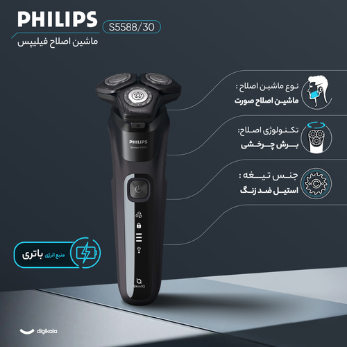 ماشین اصلاح موی صورت فیلیپس مدل S5588/30، اصلاح به صورت صفر زن، خط زن، استفاده به‌صورت خشک و مرطوب، منبع انرژی باتری ، تکنولوژی