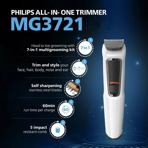 ماشین اصلاح فیلیپس مدل MG3721 از جدیدترین تولیدات این شرکت میباشد. این مدل در کشور اندونزی تحت لیسانس هلند تولید میشود و در رده خود از کیفیت خوبی برخوردار میباشد بدنه از جنس پلاستیک فشرده و مستحکم با وزنی سبک که براحتی در دست جا میگیرد و خوش دست میباشد موتور دستگاه از قدرت مناسبی بهره میبرد - باطری دستگاه با هر بار شارژ 60 دقیقه زمان کار را فراهم میکند البته زمان شارژ 960 دقیقه میباشد و باطری بعد از 5 ، 6 بار شارژ و دشارژ به حداکثر کارآیی میرسد. اندازه اصلاح تیغه 0.5 میلیمتر میباشد و تیغه براحتی از بدنه جدا میشود و قابل شستشو میباشد. دندانه های تیغه از جنس استیل پیشرفته و از نوع خود تیز شونده میباشد و نیازی به روغنکاری ندارد. این دستگاه دارای یک عدد سری موزن گوش و بینی میباشد و همچنین دارای شانه هایی برای ته ریش گذاشتن و اصلاح موی سر و یک عدد شانه برای اصلاح بدن است. میباشد این مدل دارای استندی برای قرار دادن ماشین اصلاح و اکسسوری میباشد. این دستگاه صفرزن نیست و برای اصلاح صورت از سایز نیم میلیمتر به بالا مناسب میباشد چنانچه قصد خرید ماشین اصلاح غیر صفرزن با قیمتی مناسب از برندهای رده بالا را دارید این مدل انتخاب مناسبی میباشد.
