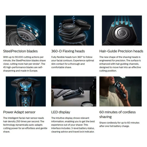 سایر مشخصاتساخت هلند با کیفیت بالا - مجهز به تکنولوژی Skin IQ - بالاترین مدل از سری 5000 فیلیپس مجهز به سنسور Power Adapt برای تنظیم خودکار سرعت اصلاح با اسکن سطح پوست و تشخیص تراکم مو - تیغه های منعطف - دارای خط زن - دارای کابل شارژ یو اس بی (بدون آداپتور) - دارای استند و کیف نگهداری - دارای 45 ریز تیغه خود تیز شونده