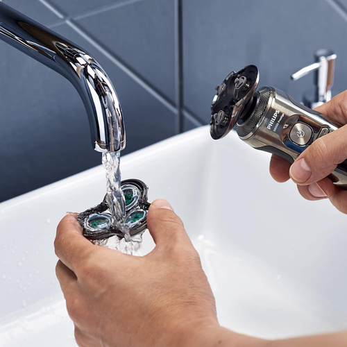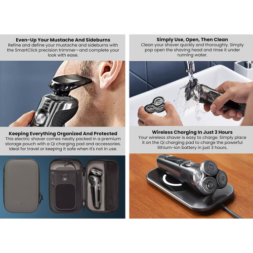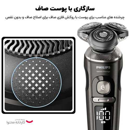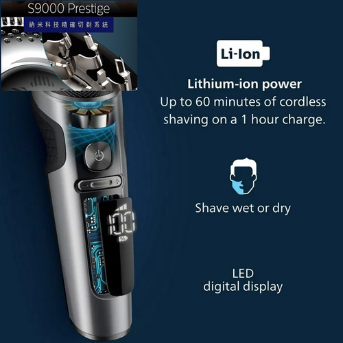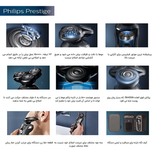سریS9000 Perestige فیلیپس خط پایان ماشین اصلاح های هوشمند فیلیپس میباشد و مدل SP9860 یکی از سه مدل فوق پیشرفته این سری ست که به انبوهی از تکنولوژیهای پیشرفته مجهز شده طراحی و کیفیت ساخت در اوج قرار دارد حتی در ساده ترین قسمت بدنه نیز از تکنولوژی استفاده شده بدنه با پوشش کروم فینیش شده است که هنگام در دست گرفتن حس کیفیت را بخوبی انتقال میدهد . در این مدل فیلیپس از پیشرفته ترین تیغه خود NanoTech Dual Precision blade استفاده کرده است سری دستگاه دارای 3 تیغه و هر تیغه از 72 ریز تیغه تشکیل شده که در هر دقیقه تا 150هزار برش را انجام میدهند و نمیگذارند هیچ مویی اصلاح نشده از تیغه رد شود تیغه ها نیز کاملا منعطف میباشد سری دستگاه نیز در 8 جهت حرکت میکند سری دستگاه مجهز به تکنولوژیهای مربوط به حساسیت پوست و حرکت روان روی سطح پوست Superb SkinGlide Coating مجهز شد و جای هیچ نگرانی برای قرمز شدن پوست باقی نماند. موتور قدرتمندTop-spin digital motor توان اصلاح موهای 7 روزه را دارد که در این مورد هیچ رقیبی ندارد این دستگاه دارای کاملترین سنسورهوشمند اسکن سطح پوست SkinIQ میباشد که نهایت یوزر فرندلی را فراهم میکند و بخوبی با نوع و اندازه مو آداپته میشود. این دستگاه دارای 3 برنامه پیش فرض اصلاح تراکم پایین ، نرمال و پرتراکم میباشد دستگاه دارای نمایشگر دیجیتال پیشرفته ایی میباشد از دیگر ویژگیهای این دستگاه شارژر وایرلس آن میباشد که با قرار دادن دستگاه روی پد شارژ صورت میگرد و در 3 ساعت کاملا شارژ میشود و تا 60 دقیقه زمان استفاده را فراهم میکند البته بوسیله این شارژ میتوان دستگاه های دیگری را نیز شارژ کرد. این مدل دارای سری خط زن مجزا میباشد و دارای کیف محکمی برای نگهداری ماشین اصلاح و اکسسوری های آن میباشد.