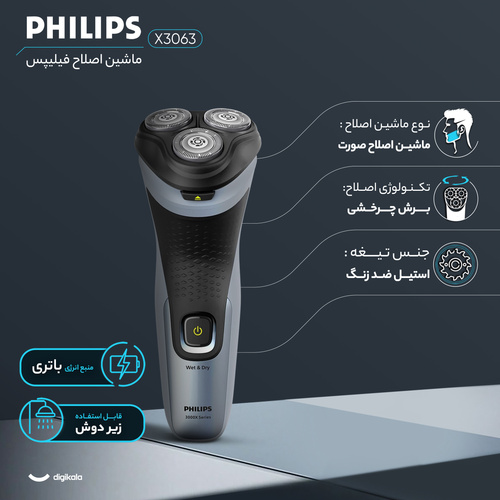 ماشین اصلاح موی صورت فیلیپس مدل X3063، اصلاح به صورت صفر زن، استفاده به صورت خشک و مرطوب، منبع انرژی باتری، تکنولوژی اصلاح به صو