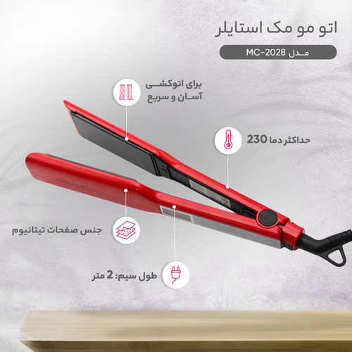 اتو مو مک استایلر مدل MC-2028، با صفحات پهن از جنس تیتانیوم، دارای دکمه‌ی روشن/خاموش، صفحه لمسی، قفل اتوماتیک صفحه و باز شدن با
