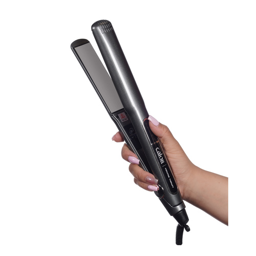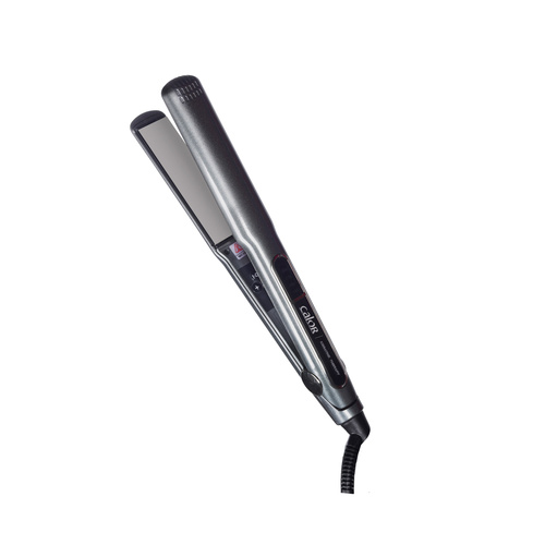 اتو مو و حالتدهنده مو کالور مدل کراتینتراپی، با صفحات از جنس تیتانیوم، دارای دسته ارگونومیک، گستره دما بیش از 240 درجه سانتیگ