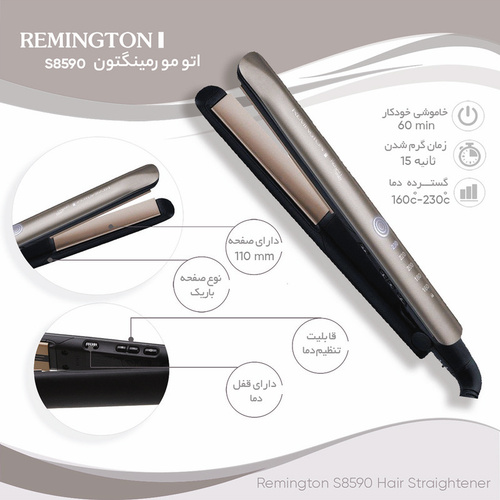 اتو و حالت‌دهنده مو رمینگتون مدل S8590، با صفحات از جنس سرامیک پیشرفته، دارای سیستم ایمنی قفل دما، یک کیف نگهداری ضد حرارت،*868