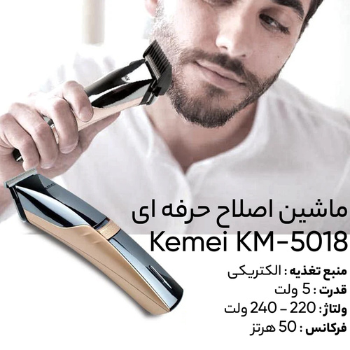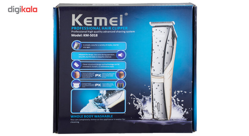 ماشین اصلاح «کیمی» مدل «KM-5018» دستگاهی برای اصلاح موهای سر و صورت مجهز به باتری قابلشارژ و کاملا ضد اب است. سر اصلاح ماشین به شکل تریمر بوده که از دو تیغهی فلزی لغزان روی یکدیگر تشکیل شده است. فاصلهی بین این دو تیغه، طول اصلاح را تعیین میکند. طول اصلاح تیغه ثابت و برابر 0.5 میلیمتر است. وزن آن 160 گرم است. برای اینکه بتوان موهای صورت را در اندازههای بیشتر از 0.5 میلیمتر کوتاه کرد، میتوان از شانهی ارائهشده همراه دستگاه استفاده کرد. انرژی ریشتراش کیمی از باتری قابلشارژ آن تأمین میشود. مدتزمان شارژ کامل باتری 8ساعت و زمان شارژدهی آن 50 دقیقه است. میتوان زیر دوش از دستگاه استفتده کرد. برای افزایش عمر تیغهها بهتر است پس از هر بار استفاده، خردههای مو را توسط برس تمیز کرده و توسط روغن موجود در جعبه، تیغهها را روغنکاری کنید. بهطور خلاصه ریشتراش KEMEI KM-5018دارای تیغهی تریمر با عرض 25 میلیمتر، طول اصلاح 0.5 میلیمتر، باتری قابلشارژ 4شانه سایزهای 3-6-9-12 بوده و برای اصلاح موهای سر و صورت مناسب است