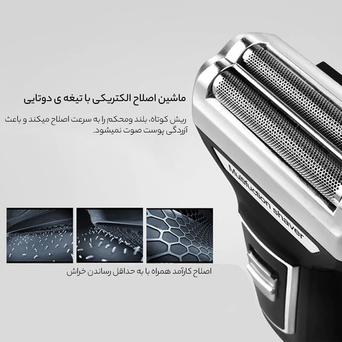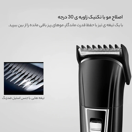 ماشین اصلاح موی صورت کیمی مدل KM-6559، اصلاح به صورت صفر زن، خط زن، دارای سه سری مخصوص برای اصلاح صورت، سر، گوش و بینی، منبع انر