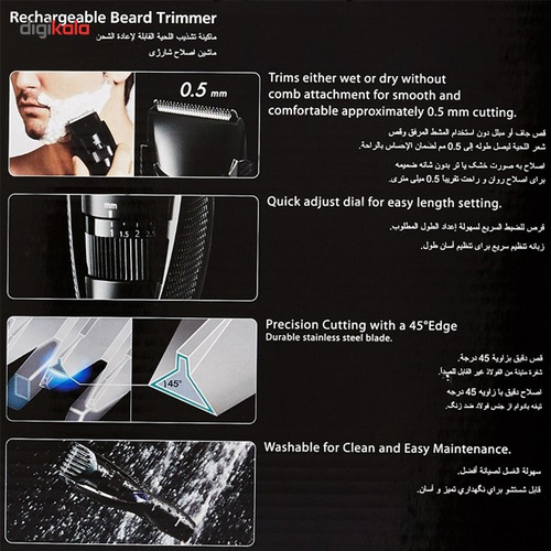 سایر مشخصات- قابلیت کوتاه کردن مو از 1 تا 10 میلی متر با دقت 0.5 میلی متر در 19 تنظیم مختلف- برش دقیق با زاویهی 45 درجه- مدت زمان شارژ بین 480 تا 600 دقیقه متغیر است