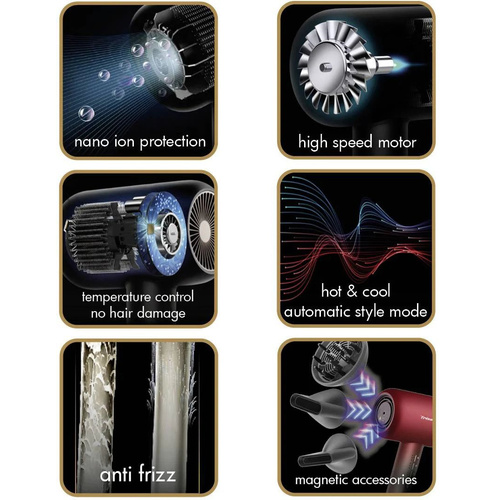 سایر مشخصاتمجهز به فناوری ترمو شیلد ( کنترل کننده دمای خروحی برای جلوگیری از آسیب رسانی به موها ) – سرعت هوای خروجی تا 110 کیلومتر بر ساعت میباشد – دارای ژنراتور دائمی تولید یون با قابلیت انتشار 4 برابری یون - وزن سشوار بدون کابل 340 گرم و وزن کلی بسته بندی 920 گرم میباشد -