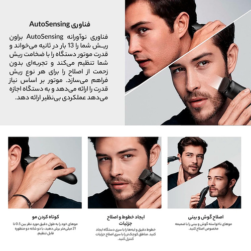 سایر مشخصاتمجهز به سنسور Auto Sensing Technology که در هر ثانیه 13 بار سطح اصلاح را برای تشخیص ضخامت و تراکم موها اسکن کرده و قدرت موتور را کم و زیاد میکند - دارای سری بادی گروم برای اصلاح بدن - دارای سری موزن گوش و بینی - دارای سری تریمر کوچک - دارای 1 عدد شانه قابل تنظیم کوچک از 3 تا 10 میلی متر - دارای 1 عدد شانه قابل تنظیم بزرگ از 11 تا 21 میلی متر - دارای دو عدد شانه 1 و 2 میلی متری -