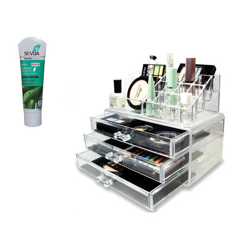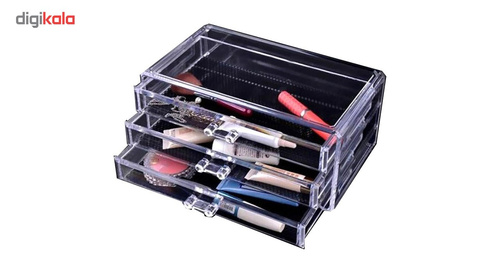 سایر مشخصاتدو تکه استند لوازم آرایش جنس ‏:‏ اکریلیک شفاف درجه یک دارای ابعادی به طول 24 وعرض 13‏.‏5 و ارتفاع 18‏.‏5سانتی متر دارای سه کشو و دو محفظه جداگانه در قسمت بالا