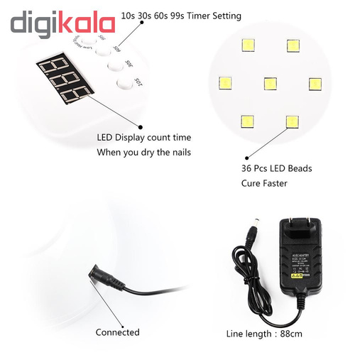 سایر توضیحات- دارای 36 لامپ ال ای دی UV برای خشک کردن بهتر و سریع تر انواع لاک ژل و چسب- LED ها با عمر بالای 50000 ساعت- دارای تایمر برای نشان دادن مدت زمان استفاده- دارای تایمر 10، 30، 60 و 99 ثانیه- دارای سنسور برای روشن شدن خودکار به هنگام قراردادن دست و پا زیر آن- قابل استفاده برای ناخن های دست و پا
