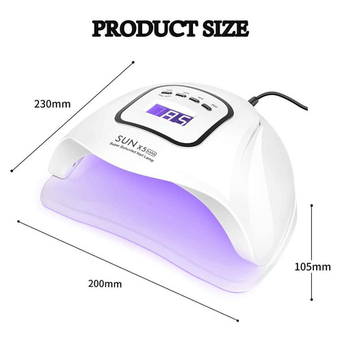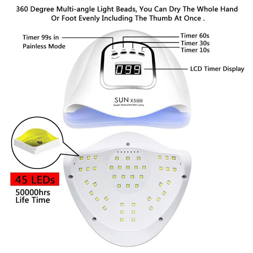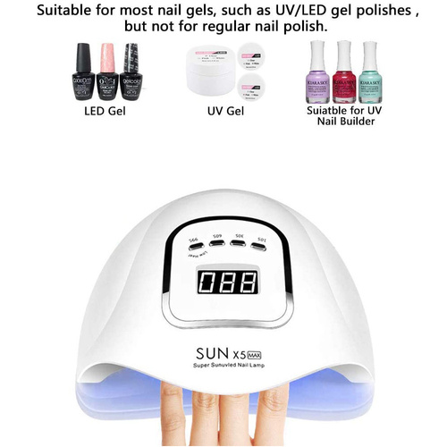 خشک کردن تقریبا تمام لاک ناخن از جمله ژل های led ناخن، ژل های UV ناخن، ژل های سخت ناخن، ژل سازنده، ژل مجسمه سازی ناخن، ژل نگینی، و ژل ال ای دی ناخن و سایر موارد استفاده از ژل، ایده آل برای استفاده در خانه و سالن. و همچنین یک هدیه خوب برای دوستان شما است. لامپ UV led دارای 150W Super Power، LED است. ویژگی های چند منظوره و محافظت از دست چراغ های ناخن UV دارای حسگر خودکار برای روشن شدن هستند. فضای وسیع برای درمان 5 ناخن در یک زمان فضای کافی خشک کن ناخن می تواند 5 ناخن انگشت را به طور همزمان خشک کند. لامپ ناخن LED SUNx5max نور سفید غیر ماوراء بنفش نور روز را برای چشم ها تولید می کند. با لامپ های فرابنفش منسوخ منفرد خداحافظی کنید که باعث دردسر سیاه شدن دست ها می شوند و برای چشم ما ضرری ندارند. و لامپ خشک کن ناخن نیز سبک وزن، کوچک، قابل حمل برای سفر است. هر زمان که بخواهید می توانید رنگ ناخن خود را با توجه به مقصد گردشگری یا حال و هوای سفر خود تغییر دهید.