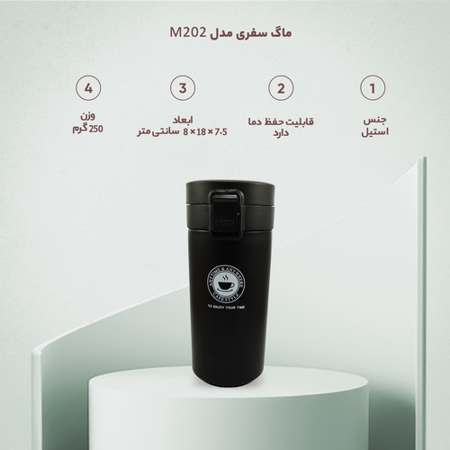 ماگ سفری یا لیوانهای مسافرتی نوعی از لیوان درپوشدار هستند که با بدنه عایق بدنی شده بوده و مانع از تغییر دمای نوشیدنی میشوند. شما با استفاده از ماگ سفری میتوانید در هر زمان که نیاز داشتید نوشیدنی مورد علاقه خود را نوش جان کنید. این ماگ دارای بدنه استیل است و قابلیت حفظ دمای سرد و داغ را دارد. جنس بدنه این ماگ استیل بوده و نوع سری آن ضامنی است. دارای استوپر در زیر ماگ است که مانع از لیز خوردن ماگ از روی سطوح میشود. این محصول دارای ضامنی صافی دار است که بدنه داخلی و خارجی آن از جنس استیل است. این محصول قابلیت حفظ دما را داشته و وزنی معادل 0.38 گرم را دارد. ماگ سفری مدل M202 گنجایش 0.38 لیتر را میتوانید در خودروی خود نگهداری کنید و یا در محیط کار خود هر زمان که دوست داشتید نوشیدنی مورد سلیقه خود را نوش جان کنید.