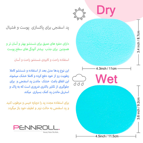 همانطور که میدانید پاکسازی پوست صورت یکی از مهمترین و تاثیرگذارترین موارد در افزایش جذابیت چهره و نشاط پوست بوده که پوستی تمیز و درخشان به ارمغان میآورد. با پد اسفنج پاک کننده صورت پنرول PENNROLL مدل PRP Facial Toast ، آرایش و یا هر نوع آلودگی ها سطح پوست خود را به راحتی و آسانی پاک نمایید. PENNROLL یکی از پیشروترین برندها در تولید محصولات و ابزار آرایشی هست که در این زمینه فعالیت داره. این مدل پدها پنرول کاملا نرم و لطیف بوده و هیچ آسیبی به بافت پوست نمیرساند و همچنین دارای حفره هایی هستند که برای پاکسازی پوست بسیار کاربردی و مفید می باشند. شما میتوانید از این محصول برای پاکسازی روزانه، فشیال، پاک کردن آرایش، ماساژ پوست، رطوبت گیری پوست، و همچنین برای انواع ماسک ها روی پوست و غیره... استفاده کنید. جهت استفاده از پدهای PRP Facial Toast پنرول بهتر است پد را به پاککننده یا ژل شستشو صورت آغشته نموده و با حرکاتی دورانی روی صورت بچرخانید تا تمام پوست صورت از آلودگیها و لوازم آرایشی پاک شود. این مدل پدهای پنرول قابلیت خود ایمنی در برابر هوا را دارند بطوریکه پس از استفاده اگر در محیط و بدن محفظه قرار گیرد بعد از مدتی کاملا رطوبت را از خود دفع کرده و کاملا خشک میشود و اجازه تکثیر باکتری را در محیط مرطوب خود را نمیدهد. زیرا باکتری ها در محیط مرطوب بسرعت تکثیر میشوند. این محصول از با کیفیت ترین مواد اولیه PVA ساخته شده و بدون تغییر فرم و شکل اولیه خود بارها قابل شستشو میباشد؛ اما توصیه میشود که پس از مدتی استفاده از پد را حدودا 1 الی 2 ماه تعویض نمایید.