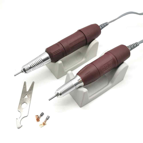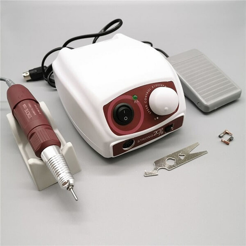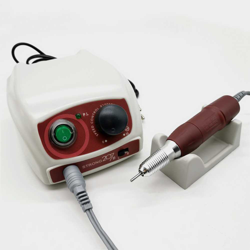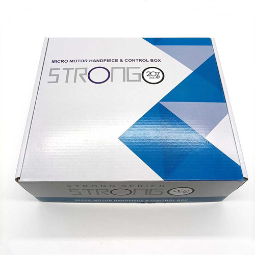 دور موتور این دستگاه 30000 دور می باشد که متاسفانه برخی از همکاران این دستگاه را به عنوان 35000 دور به فروش می رسانند. توجه داشته باشید که در هنگام انتخاب این دستگاه شما با یک دستگاه 30000 دور روبرو هستید، پس اگر برای کار خود به دستگاهی با قدرت بالا تر نیاز دارید به سراغ سایر برند ها بروید. سوم: این دستگاه دارای دو نوع دسته آرایشی سبک و لابراتواری می باشد.در استفاده از سوهان برقی، به دلیل سرعت و قدرت فوق العاده آن باید نهایت دقت و آرامش را به خرج داد تا نتیجه کار تا حد ممکن ایده آل و بی خطر از آب درآید.در جلوی دستگاه استرانگ 207 دیمر دستگاه و سوکت هندپیس دستگاه را مشاهده می نماییم، همچنین دکمه پاور دستگاه که وظیفه روشن و خاموش کردن دستگاه را به عهده دارد، در استرانگ 207 هنگامی که دستگاه در حالت خاموش باشد پدال پایی آن فعال می شود و دیگر اثری از دکمه مجزا برای پدال دیده نمی شود. دکمه تغییر جهت گردش هندپیس از راست گرد به چپ گرد را نیز مشاهده می نماییم. دیمر نیز برای کنترل سرعت چرخش دستگاه از 0 تا 35000 دور استفاده می شود.