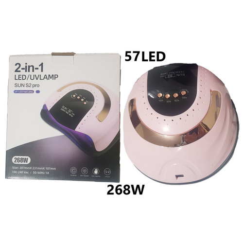 دستگاه یووی سان مدل SUN S2 PRO یکی از جدیدترین و بهترین دستگاه های بازار می باشد. مزیتی که ، یو وی ال ای دی 268 وات مدل S2 PRO دارد این است که دارای تایمر خودکار، سنسور خودکار و صفحه نمایش دیجیتال می باشد. این محصول با 57 عدد لامپ قادر است هر نوع ژلی را در کمترین زمان خشک نمایید. روی دستگاه دکمه هایی قابل مشاهده است. 3 دکمه اول که برچسب 10s ، 30s، 60s و روی آن ها مشاهده می شود. بیانگر تایمر های 10،30، 60 ثانیه با قدرت کامل دستگاه یعنی 268 وات هستند. دکمه چهارم که با برچسب 99s Low Heat Mode مشخص شده است بیانگر تایمر 99 ثانیه با قدرت تقریبا نصف قدرت دستگاه می باشد. این دکمه به شما امکان میدهد برای خشک کردن ژل بیلدر هایی که گاها هنگام خشک شدن دست مشتری را می سوزانند با استفاده از نصف قدرت دستگاه و تایم بالاتر از سوختن ژل جلوگیری نمایید.